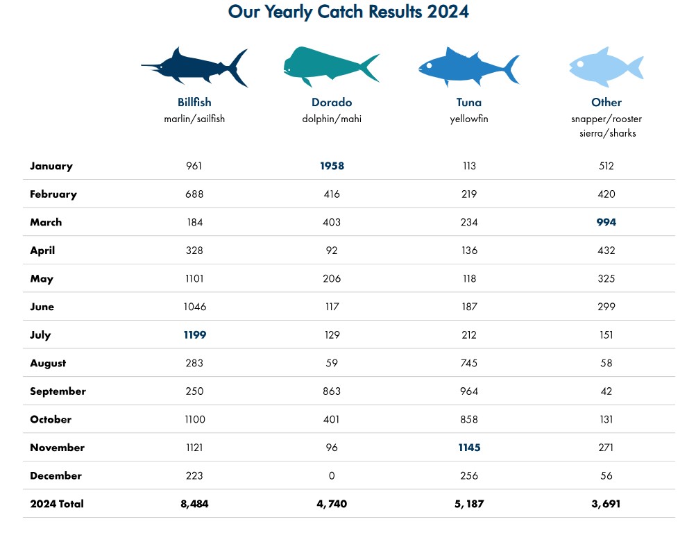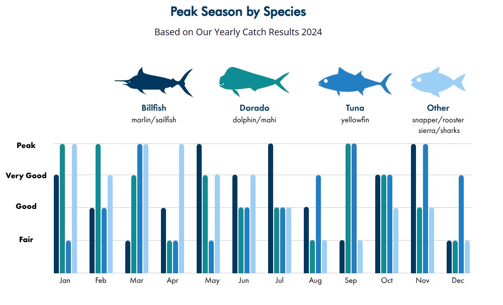 Marlin (Striped, Blue & Black), Sailfish, Dorado (Mahi), Yellowfin Tuna, Roosterfish, Wahoo, Snapper, and more!