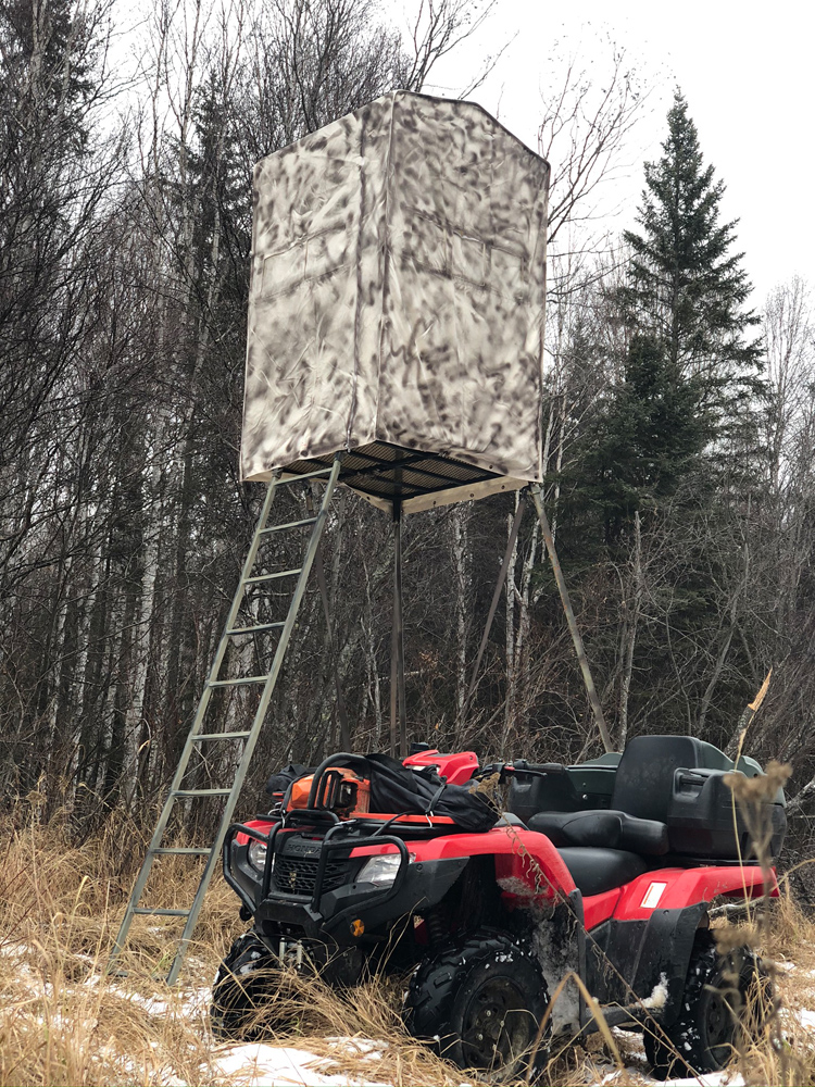 This Northern Alberta whitetail hunt offers a mix of hunting styles tailored to deer behavior. Hunters may travel by 4×4 trucks, ATVs, and occasionally on foot to reach productive areas. The most effective method, however, is stand hunting from strategically placed setups. These include tower stands, tree stands, and ground blinds located along cut lines, feeding areas, and natural travel routes marked by scrapes and other rut sign.